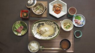 当店は日本料理的なものも織り交ぜた定食で最後は甘味とお茶、なので、懐石の方を使ってみた。