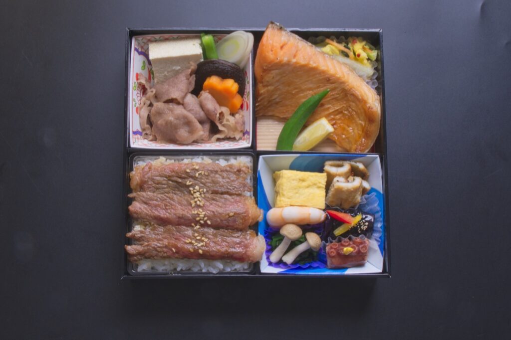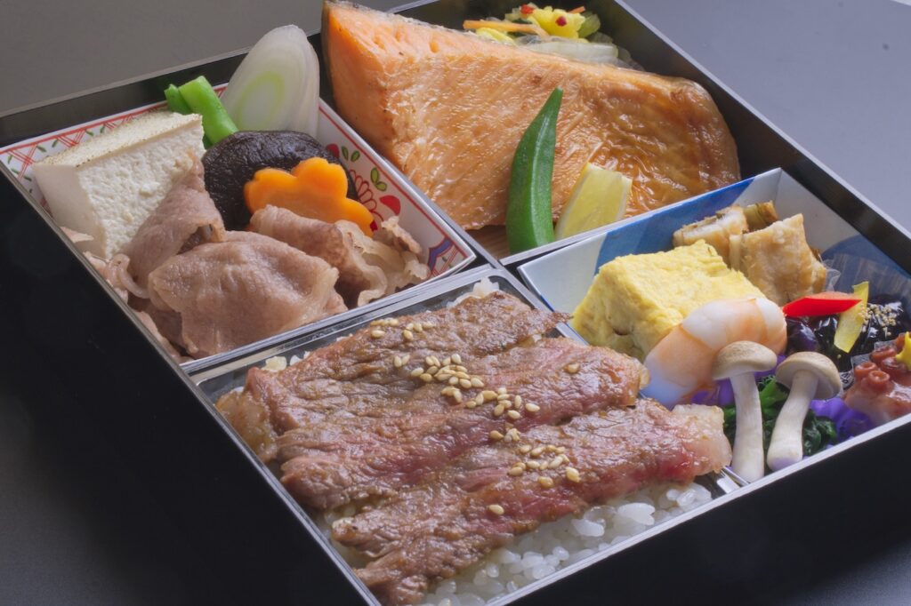 牛ステーキ、すき焼き、鮭の特選松花堂