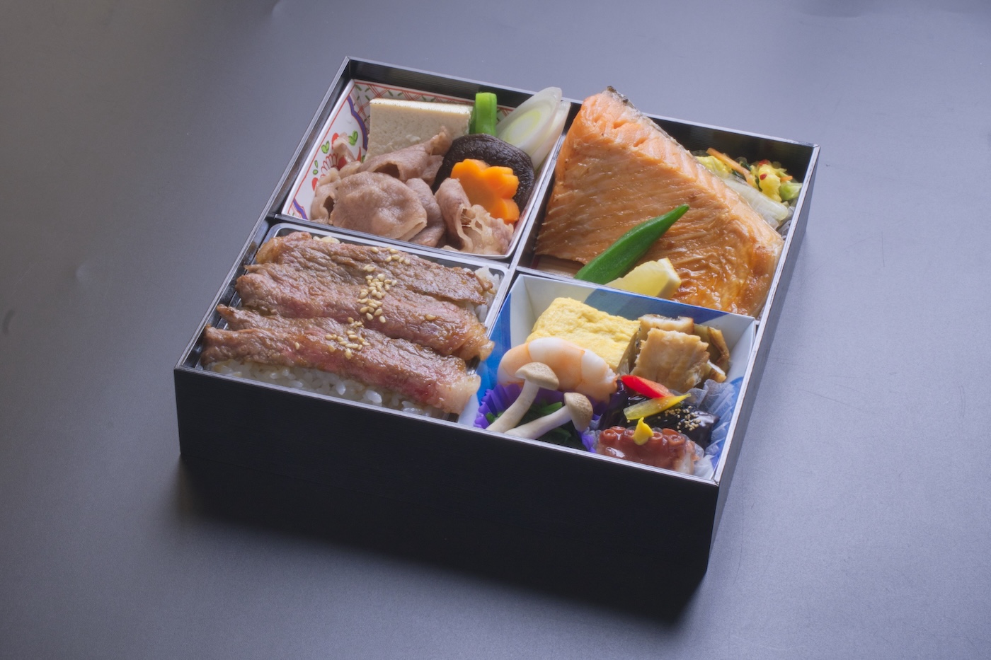 牛ステーキ、すき焼き、鮭の特選松花堂
