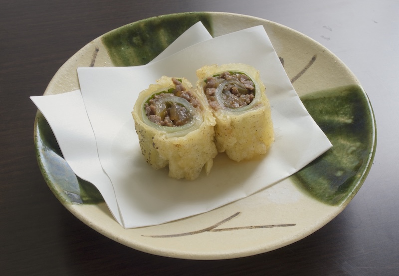 ”自家製の牛肉の挽肉”と玉ねぎに下味をつけて、桂むきしたジャガイモと大葉で巻いて天ぷらにしました。