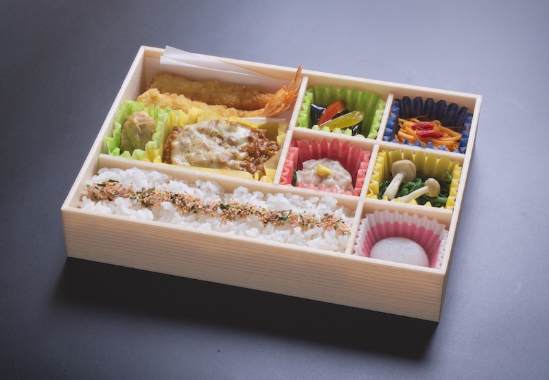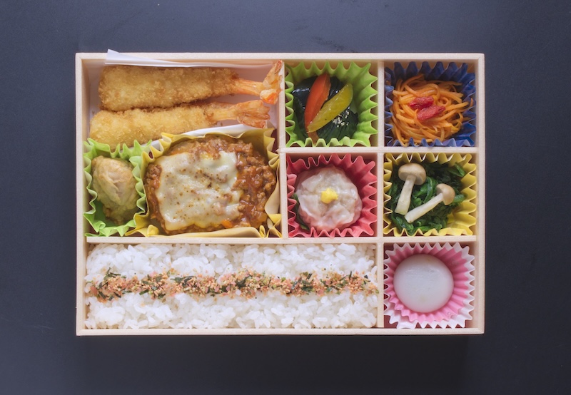 ハンバーグとエビフライ・カラフル弁当¥2160 法人様用仕出し弁当 2025.10.06 ハンバーグとエビフライ・カラフル弁当¥2160/お茶付き税込 エビフライ2尾 炙りチーズのせハンバーグ 唐揚げ 揚げナス和風味 焼売 ほうれん草 甘味団子 人参しりしり 白米/ふりかけ一袋 お茶500ml 弁当箱サイズ241mm×165mm×H39mm