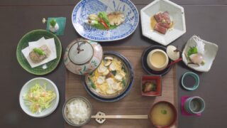 和食、日本料理を中心とした季節のお料理色々、ご飯と味噌汁、最後に甘味とお茶の懐石定食
