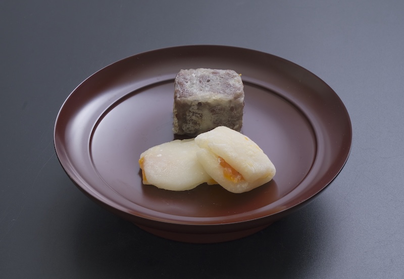 - 甘味(干し柿羽二重餅と小さなきんつば)とお茶