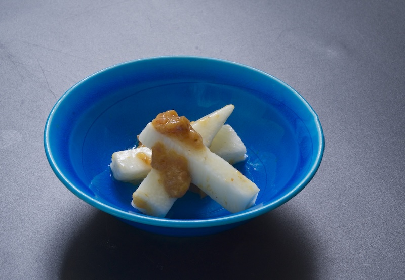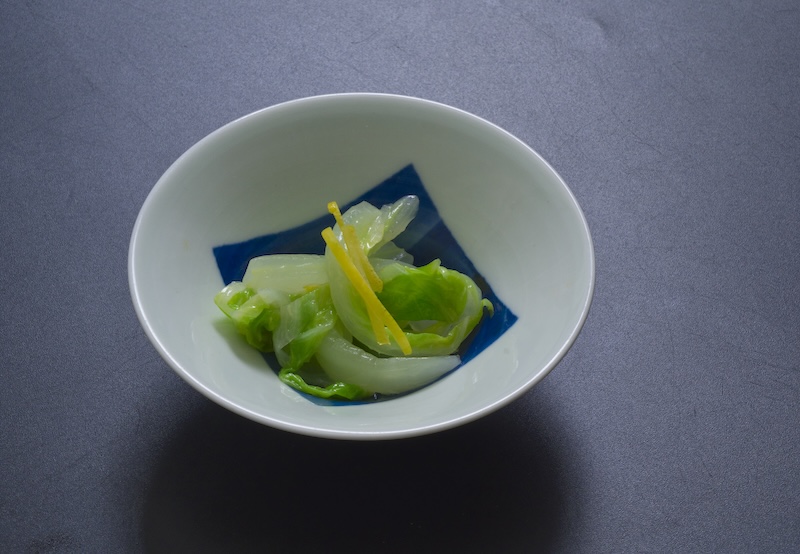 旬の白菜にレモンと柚子の風味をつけた漬物とサラダの中間的な逸品。