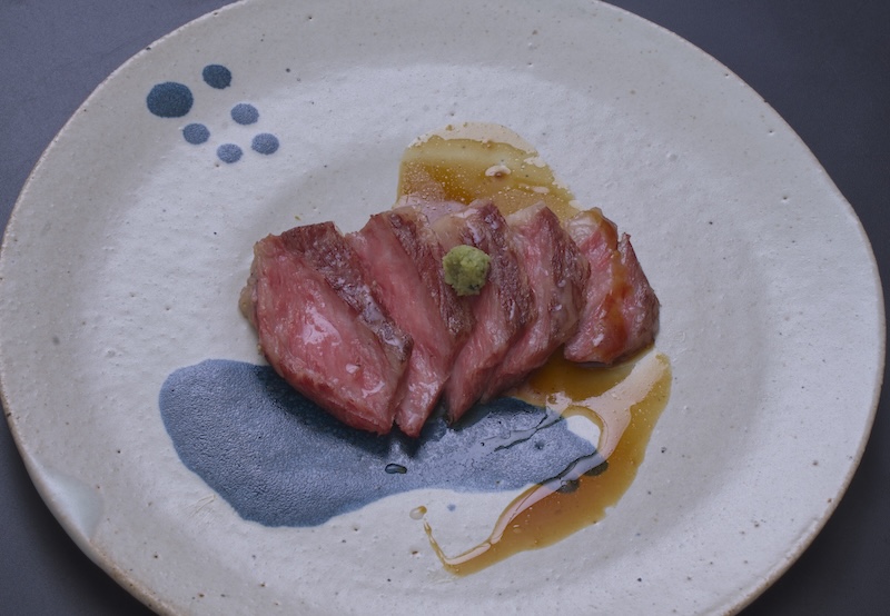 低温調理加熱した牛ステーキの薄切り、甘だれ