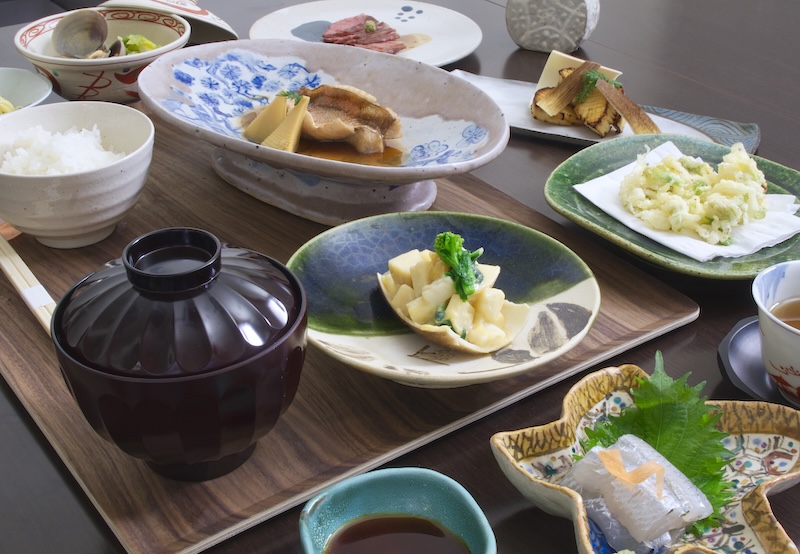和食、日本料理を中心とした季節のお料理色々、ご飯と味噌汁、最後に甘味とお茶の懐石定食