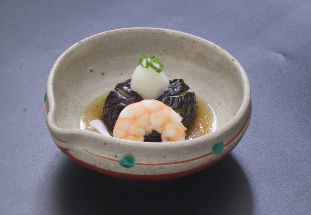 鰹出汁で作ったお汁に揚げた茄子に大根おろしと海老を添えて。